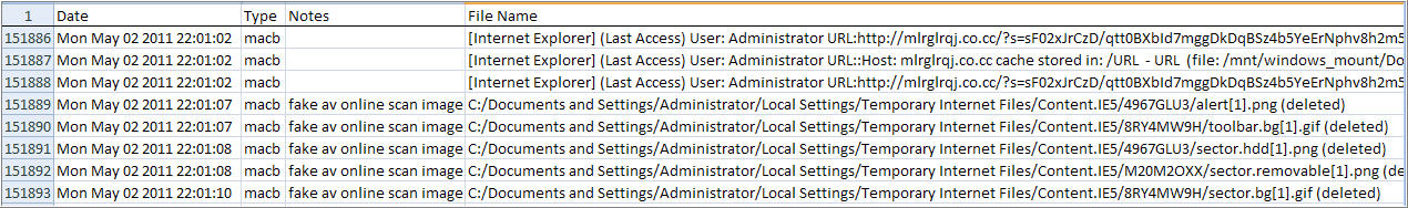 At this point a Google image search resulted in the Internet Explorer browser being redirected to the mlrglrqj.co.cc domain where a fake online scanner was located. To see how this occurred forensically, the activity of the Google image being accessed needs to be examined. The portion of the timeline below shows the Google image URL that was accessed and this resulted in the image (line 151879) and a webpage (line 151880) being downloaded to the system. The timeline also shows a webpage, mlrglrqj.co[2].htm, being downloaded six seconds after the image was accessed (line 151881).